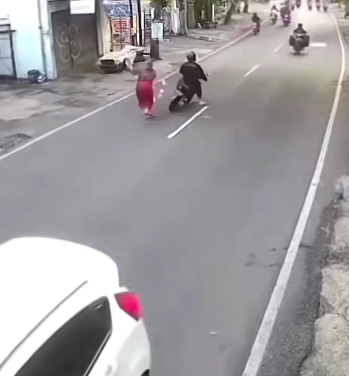 Perubahan arah yang mendadak ini langsung menciptakan situasi berbahaya bagi pengendara di belakangnya. Pengendara sepeda motor yang melaju di jalur tersebut pun terkejut dan bereaksi cepat untuk menghindari tabrakan. Dalam upaya penyelamatan diri, ia membanting setir ke kanan, berharap bisa melewati ibu-ibu yang tiba-tiba berhenti.